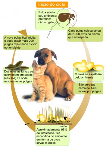 Assim, é fundamental manter limpos e desinfetados os locais ideais para a reprodução do ciclo de vida do parasita, a fim de evitar o seu ressurgimento poucas semanas depois. De modo geral, os ovos caem do animal e se depositam em frestas do chão e em meio a fibras de tapetes, até evoluírem e chegar à fase adulta.